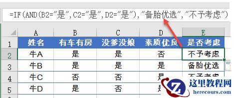 =IF(AND(B2=”是”,C2=”是”,D2=”是”),”备胎优选”,”不予考虑”)