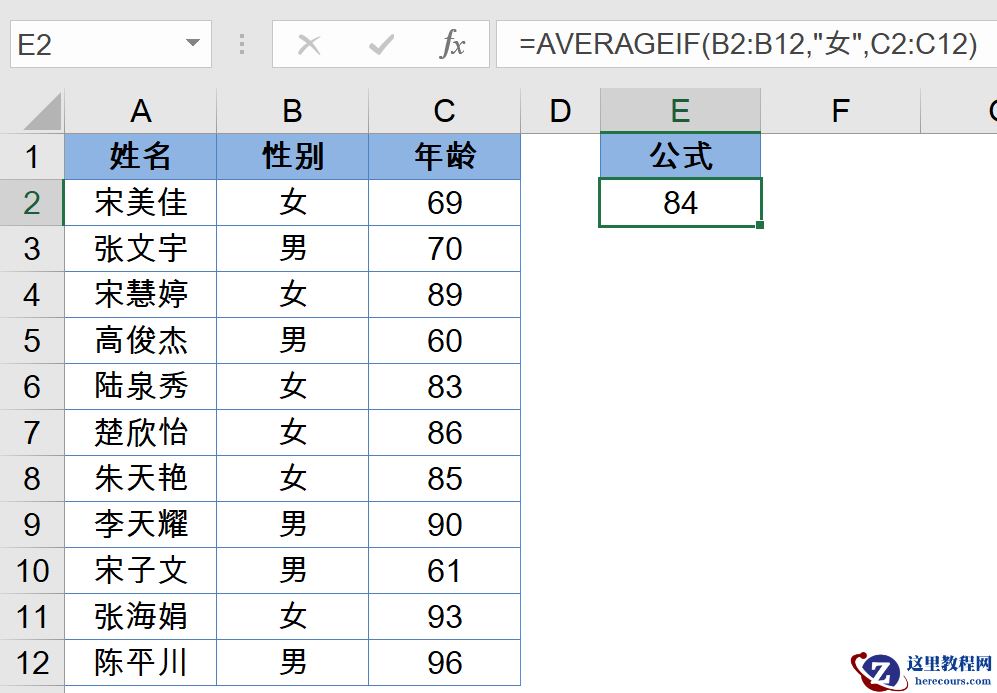 =AVERAGEIF(B2:B12,”女”,C2:C12)