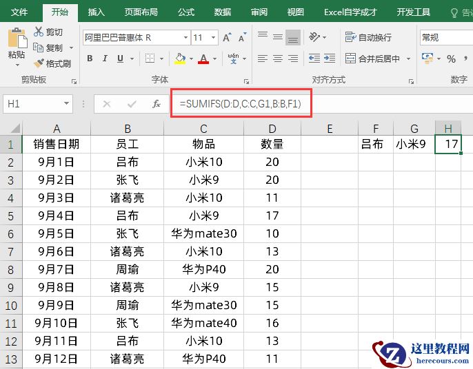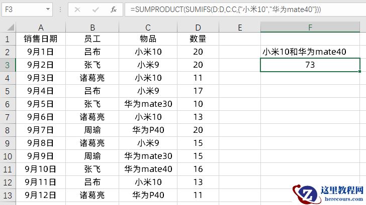 比如员工吕布销售的小米9,那么还需要增加一个条件判断了,我们使用的公式是: