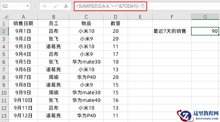 如果条件里面有时间这个条件,那么就需要注意了,比如我们现在要统计最近7天的销量,今天是9月14日,那么我们可以输入的公式是: