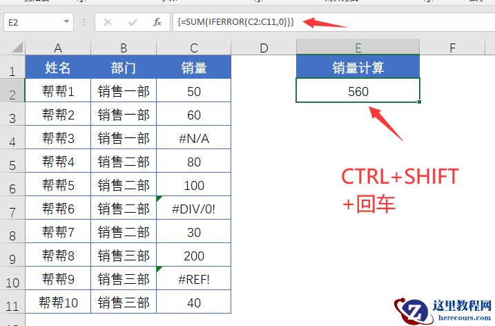 メ使用函数{=SUM(IFERROR(C2:C11,0))},三键公式。先把错误值转换为0,再SUM求和。メ