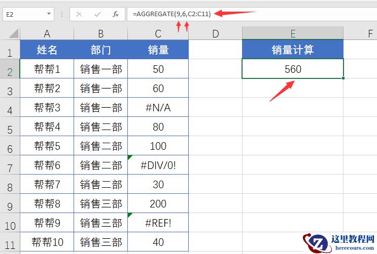メ第三种方法,=AGGREGATE(9,6,C2:C11),AGGREGATE第一参数一共19项,9便是求和,第二参数一共8项,6便是忽略错误值。メ