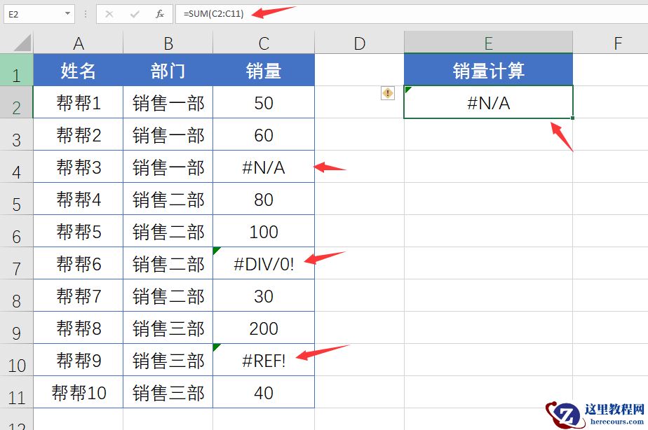 メ大家请看范例图片,数据源包含错误值,输入函数=SUM(C2:C11),结果仍为错误值。メ