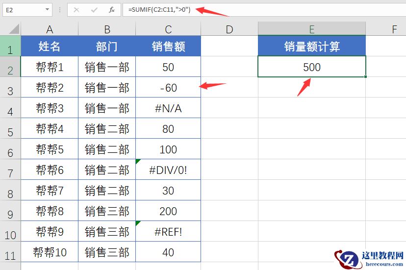 メ但是大家注意,如果是负值内容,=SUMIF(C2:C11,”>0″),要过滤到错误值以及负值。メ