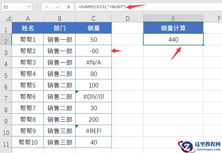 メ第五种方法,可以使用=SUMIF(C2:C11,”<9e307″),<9e307代表Excel能接受的最大数值,完成SUMIF判断求和。メ