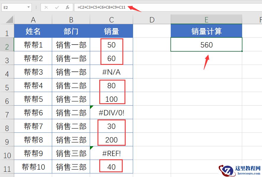 メ我们可以手动过滤错误值,=C2+C3+C5+C6+C8+C9+C11,得出结果,这似乎有点傻。メ
