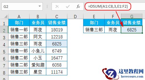 2、多条件查找查找部门为“销售三部”且业务员为“雨夜”的销售业绩: