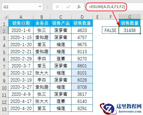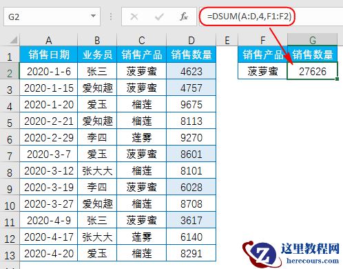 输入公式:=DSUM(A:D,4,F1:G2)