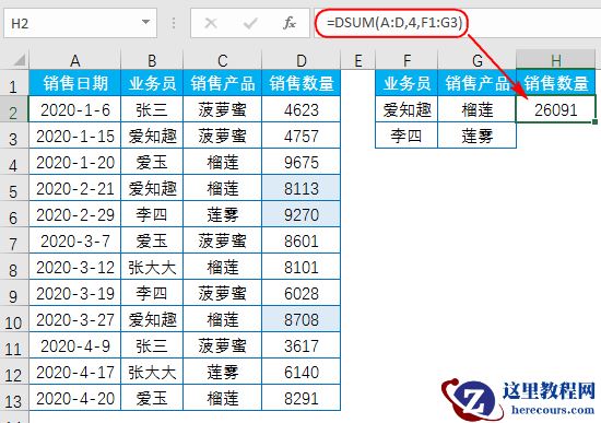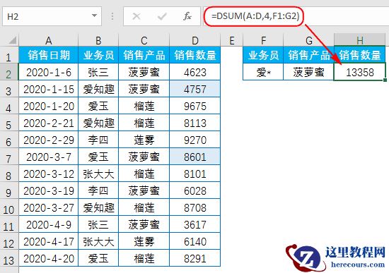 4、求业务员为“爱知趣”且销售产品为“榴莲”的总销售数量: