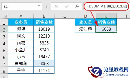 输入公式:=DSUM(A1:B8,2,D1:D2)