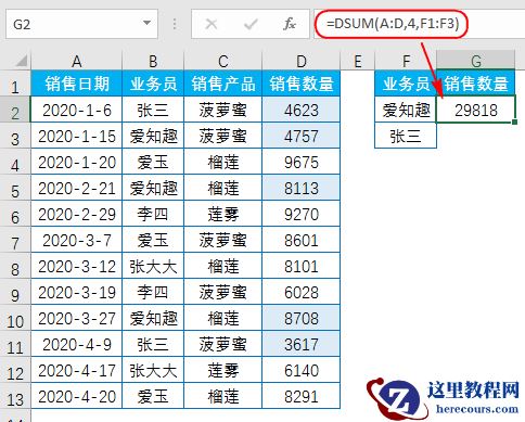 输入公式:=DSUM(A:D,4,F1:G3)