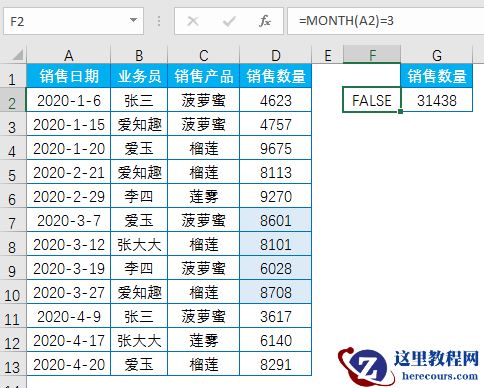 F2单元格公式:=MONTH(A2)=3
