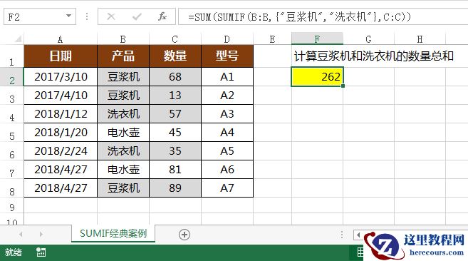=SUM(SUMIF(B:B,{“豆浆机”,”洗衣机”},C:C))