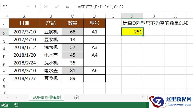 案例4:计算D列型号不为空的数量总和