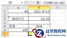 案例:A1:B6区域,用COUNT函数统计出的数字单元格个数为4。日期和时间属于特殊的数字序列。