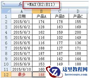 在B12单元格输入公式:=MAX(B2:B11),然后向右拖动复制得到产品B和产品C的最大产量。前面我们说了excel取最大值函数有MAX函数和LARGE函数,那么LARGE函数一样可以做到,公式为=LARGE(B2:B11,1)。