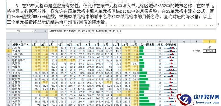 我们需要在S3单元格求得某个地区某月的降水量,根据表格我们知道如果我们知道要求的地区在第几行和要求的月份在第几列,我们就能用INDEX函数求出降水量,而想知道要求的地区在第几行和要求的月份在第几列可以用MATCH函数来求得。