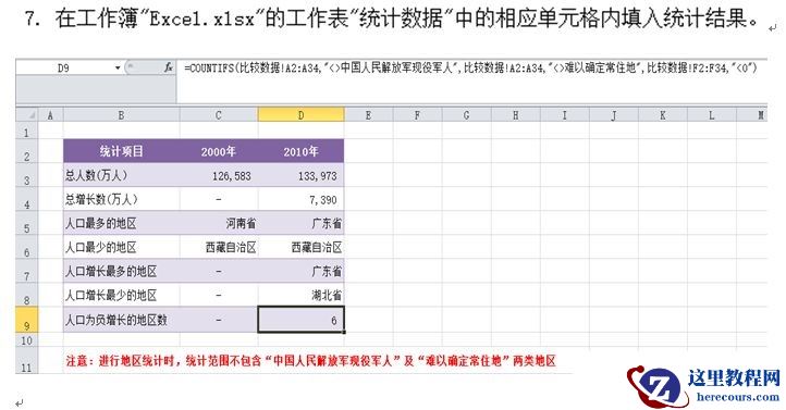 我们需要在D9单元格求得人口为负增长的地区数,还要注意不能包括红色文字中的2个地区,所以我们需要满足3个条件的计数,那就要用到多条件计数函数COUNTIFS,在D9单元格输入“=COUNTIFS云 ”,点击fx打开函数对话框,分别输入3个条件区域和条件。