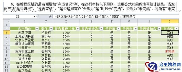 然后再用IF函数就可以完成这道题了,即=IF(AND(F3=”是”,G3=”是”,H3=”是”),”完成”,”未完成”)。