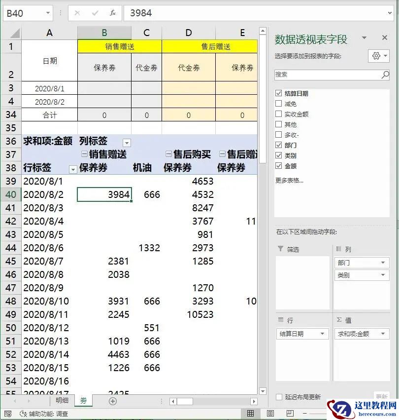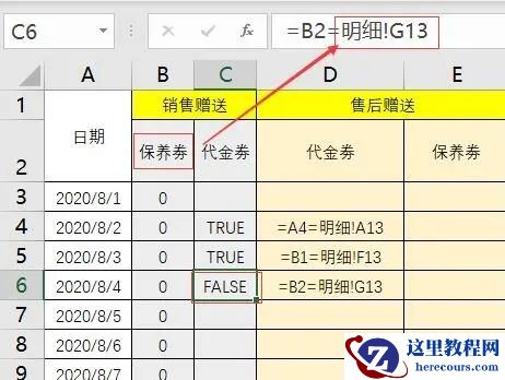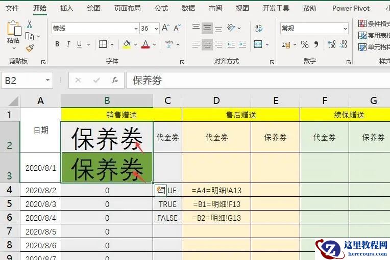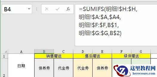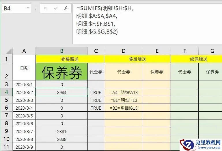公式写好,双击填充一看,全是0,还真的不能用呢!!通过第一张图我们能看到 2020年8月2日 销售赠送 的保养劵有三笔,一共3984,可为什么Sumifs却无法求出来呢?