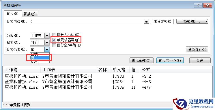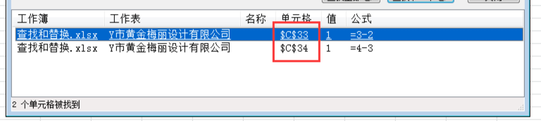 这时,我们将“查找范围”修改为“值”,并勾选“单元格匹配”。单击“查找全部”即可查找到了我们需要的数字1(单元格C33和C34)。