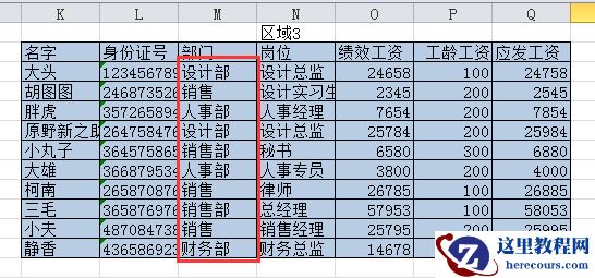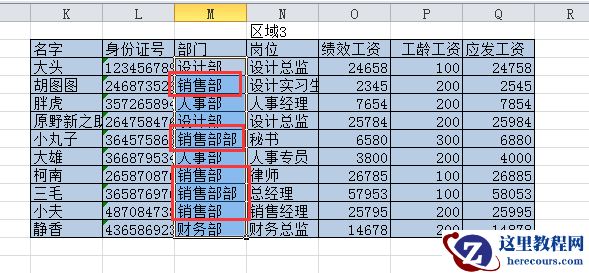 如下图所示的区域3表格中,我要将部门列的“销售”改为“销售部”。