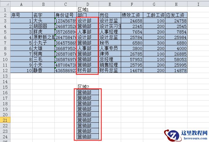 我们可以看到如下图所示结果,区域1和区域2中的“销售部”都变成了“营销部”。由于我们查找替换前没有先选中区域1,所以excel很智能地对整个工作表进行了查找和替换。