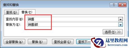 按替换快捷键Ctrl+H,在弹出的对话框中,“查找内容”后面输入“销售”,“替换为”后面输入“销售部”,设置好后点击全部替换。