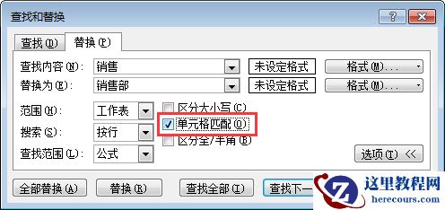 怎么办?我们需要回到前一步骤,在“替换”对话框中,点击“选项”,然后在显示的各选项内容中勾选“单元格匹配”。单元格匹配指的只查找单元格的值等于查找内容的单元格,属于绝对匹配。
