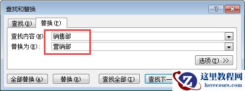 此时,若我们没有先选定区域1 ,而是直接按替换命令快捷键Ctrl+H,弹出对话框。在“查找内容”里输入“销售部”,在“替换为”里输入“营销部”,设置好后点击 “全部替换”。