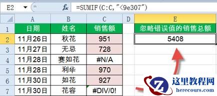 求和参数省略,以条件区域C:C作为求和区域,求和条件是<9e307,相当于对所有数值求和。