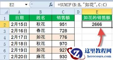 如果B:E列等于求和条件“如花”,则对C:F列求和。
