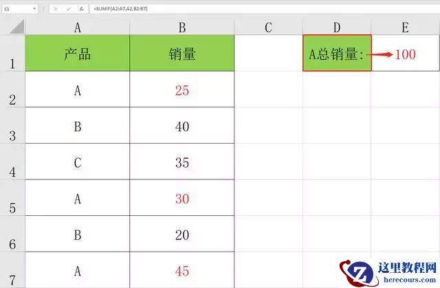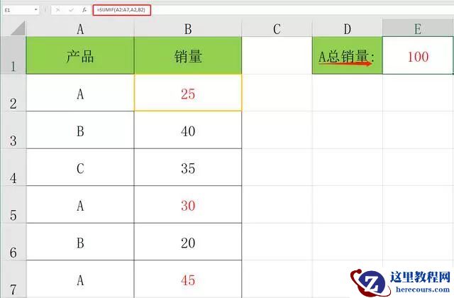 メ案例二:求和计总产品A的总销量。输入函数:=SUMIF(A2:A7,A2,B2:B7)。メ