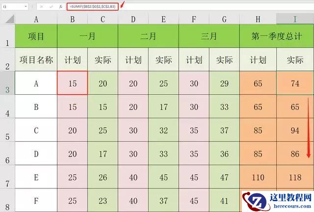 メ再求总实际值,在I3输入函数:=SUMIF($B$2:$G$2,$C$2,B3)并下拉复制。メ