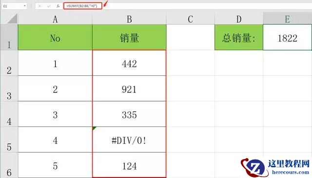 メ大家请看范例图片,下表中我们要计总销量,表格中有一错误单元格,我们先用SUM函数,输入函数:=SUM(B2:B6),结果出错。メ