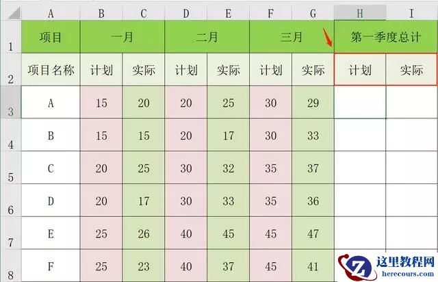 メ案例三:计划实际表计总。计总第一季度各项目计划与实际总值。メ