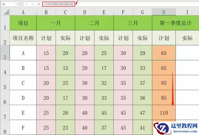 メ先求总计划值:在H3输入函数:=SUMIF($B$2:$G$2,$B$2,B3)并下拉复制就可以啦。メ