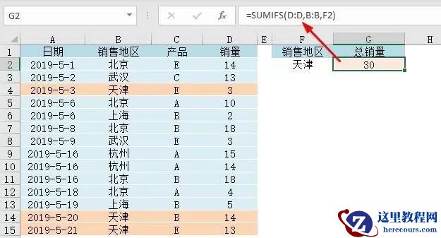 【例7】统计武汉产品A、B和天津产品A、B的总销量