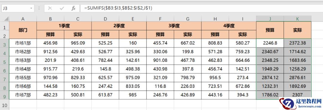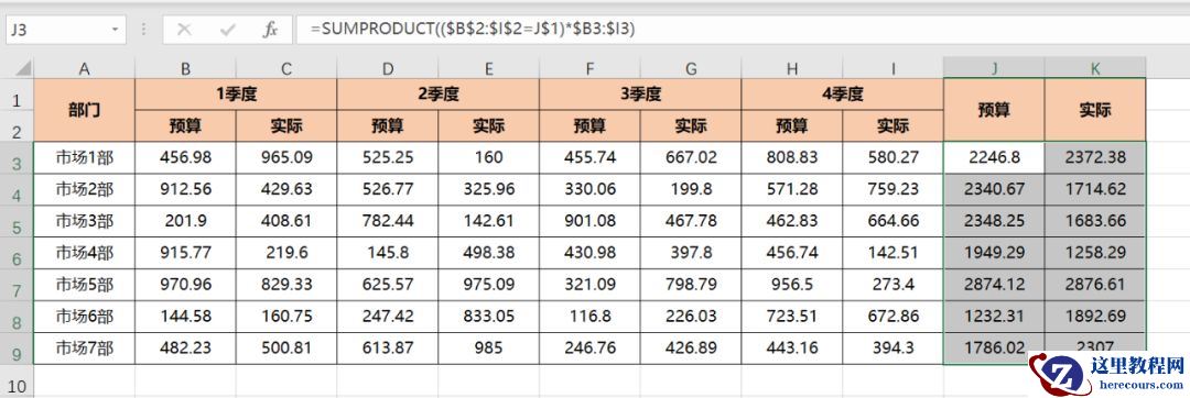 如下图,是一份市场部各季度的预算与实际费用发生的情况。现需要计算一年内预算与实际的合计。