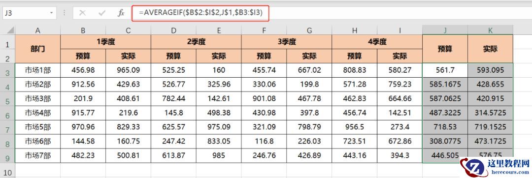 在J3中输入公式为:=AVERAGEIFS($B3:$I3,$B$2:$I$2,J$1)。之后分别向右向下填充即可。