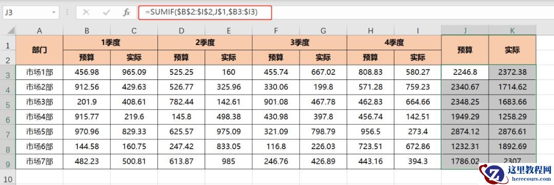 在J3中输入公式:=SUMIF($B$2:$I$2,J$1,$B3:$I3)。之后分别向右向下填充即可。