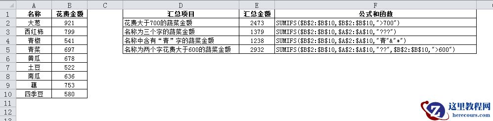 在A2:A10区域内蔬菜名称为两个字,在B2:B10区域内数字大于600,同时满足这两个条件的蔬菜,进行花费金额求和