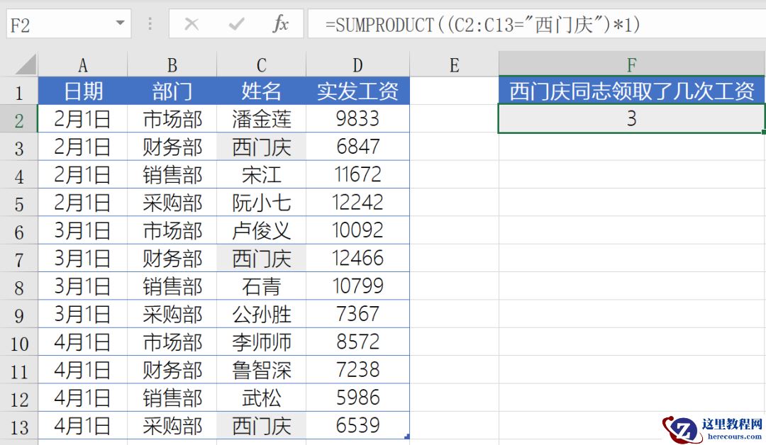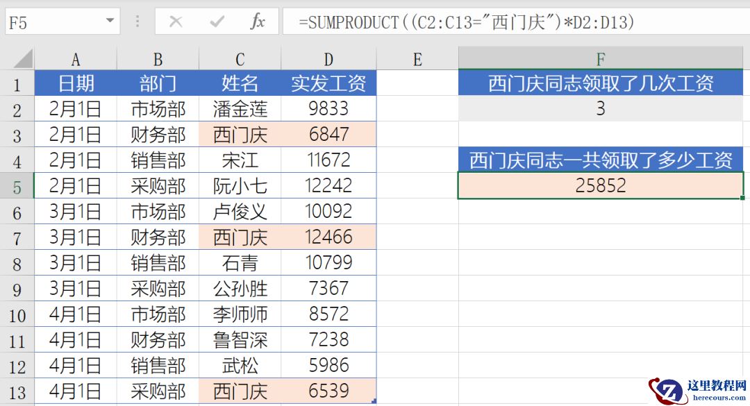 二,西门庆同志一共领取了多少工资?这是一个单条件求和的问题,通常我们使用SUMIF函数,如果使用SUMPRODUCT函数,我们可以写成这样:=SUMPRODUCT((C2:C13=”西门庆”)*D2:D13)