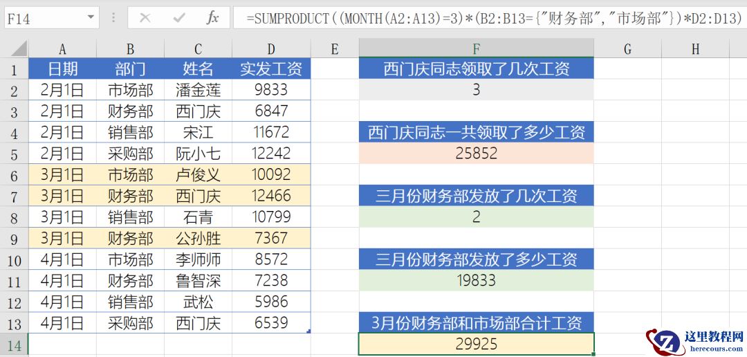 SUMPRODUCT跃然而至:=SUMPRODUCT((MONTH(A2:A13)=3)*(B2:B13=”财务部”),D2:D13)