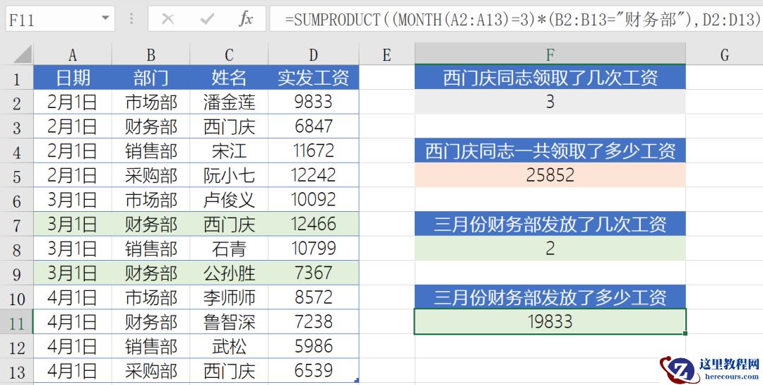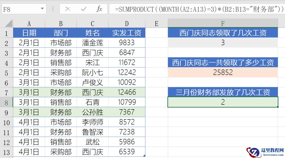 三,3月份财务部发放了几次工资?3月份财务部发放了几次工资,这是一个多条件计数的问题哈:第一个条件,发放工资的时间必须是3月份;第二个条件,发放工资的部门必须是财务部。如果使用多条件计数函数COUNTIFS,判断发放工资的时间是否属于3月份,会简单问题复杂化。而使用SUMPRODUCT函数,咱们可以简单利索的写成这样:=SUMPRODUCT((MONTH(A2:A13)=3)*(B2:B13=”财务部”))