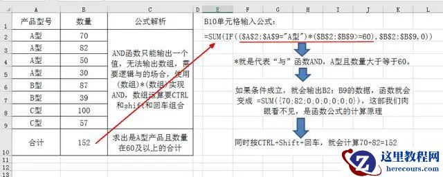 =SUM(IF(($A$2:$A$9=”A型”)*($B$2:$B$9>=60),$B$2:$B$9,0))。因为AND函数只能输出1个数,1或0,也就是TRUE(真)或FALSE(假),所以用 * 乘号代替AND。