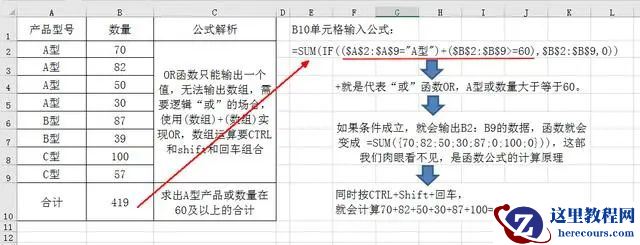 =SUM(IF(($A$2:$A$9=”A型”)+($B$2:$B$9>=60),$B$2:$B$9,0))。因为OR函数只能输出1个数,1或0,也就是TRUE(真)或FALSE(假),所以用 + 加号代替OR。