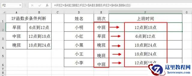 如 -2:这时在E列的位置随便填入早班、中班或晚班,F列设置过公式的地方就会自动显示对应结果。