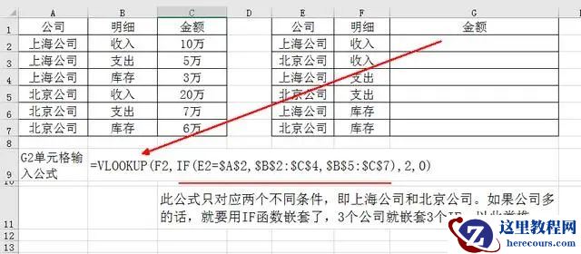 如 -1:在G2单元格里输入 =VLOOKUP(F2,IF(E2=$A$2,$B$2:$C$4,$B$5:$C$7),2,0),当E2内容是上海公司时,就和A2内容一致,条件成立,if 输出的结果就是B2:C4;内容如果不一致,则输出B5:C7区域。加绝对值是为了防止数据偏移,这样不同的条件就会对应不同的数据区域。