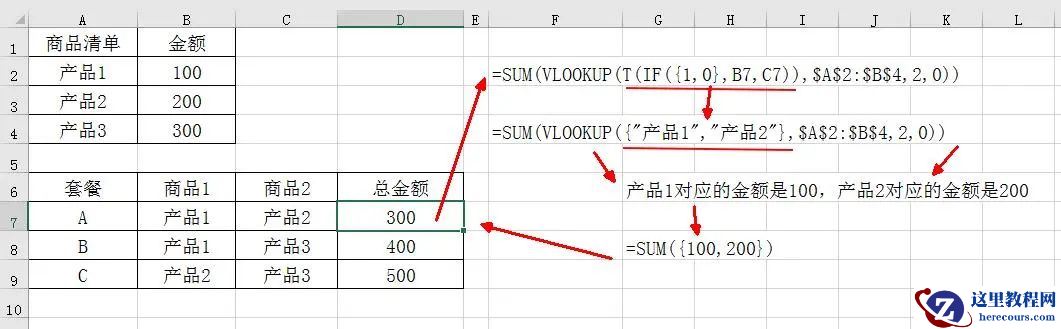 详细说明:因为B7和C7分别是文本“产品1和产品2”,所以用T(if),可以将这两个文本组合成数组,对数组进行VLOOKUP匹配,这样就实现多个查找值同时匹配。如果查找值是数字,把T(if) 换成 N(if)。